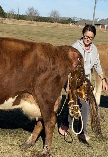 Her udder is much larger than a normal beef cow because she is half dairy and half beef.