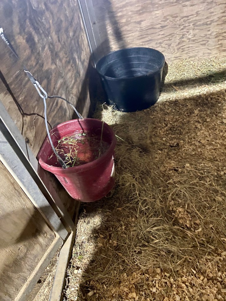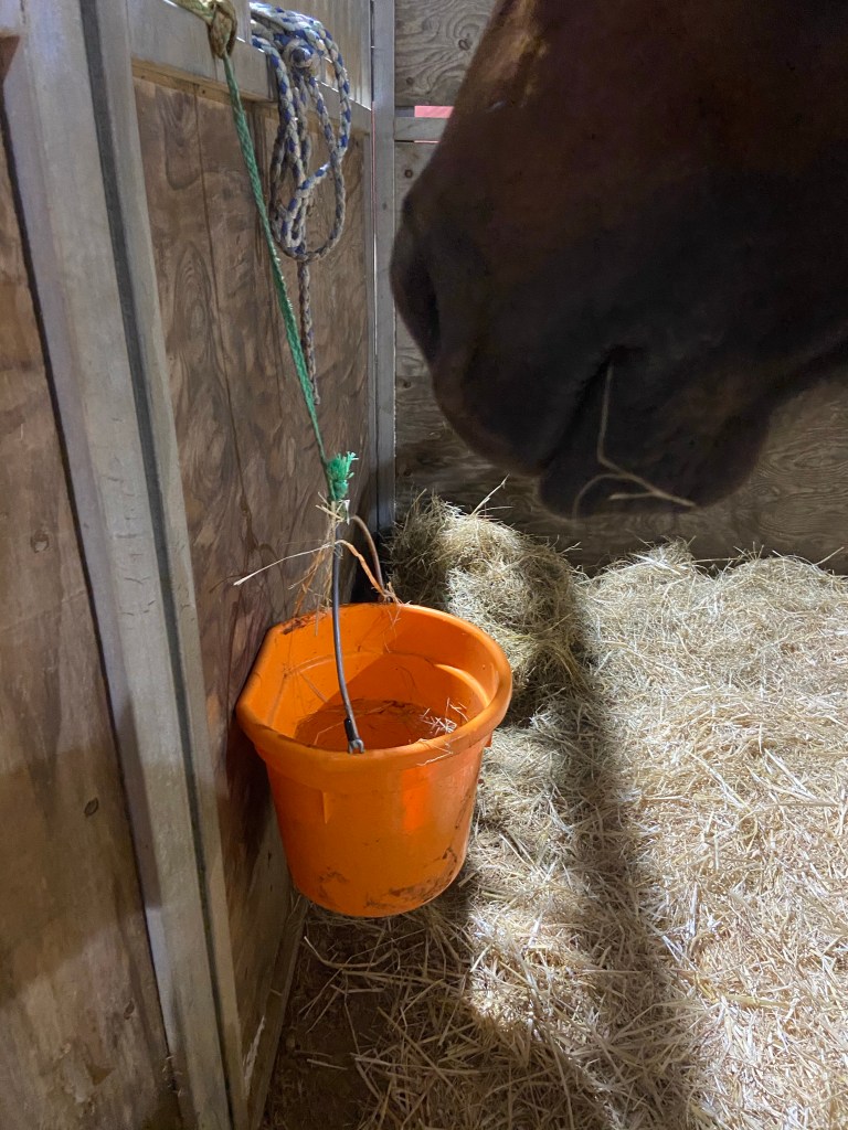 I see many people hanging hay bags up high in the stall. They do this so that the horse can’t get tangled up in the hay bag.