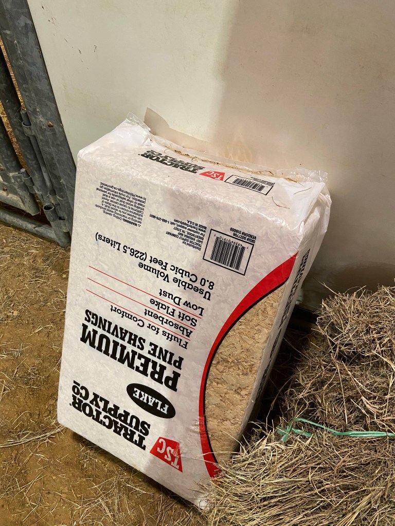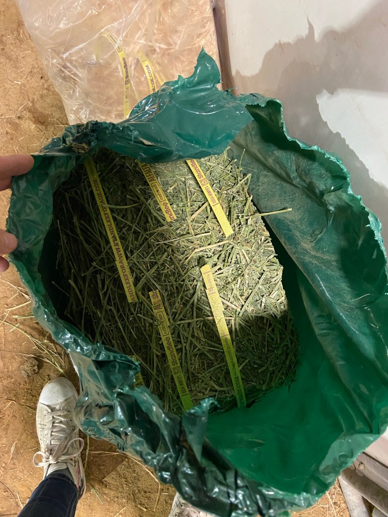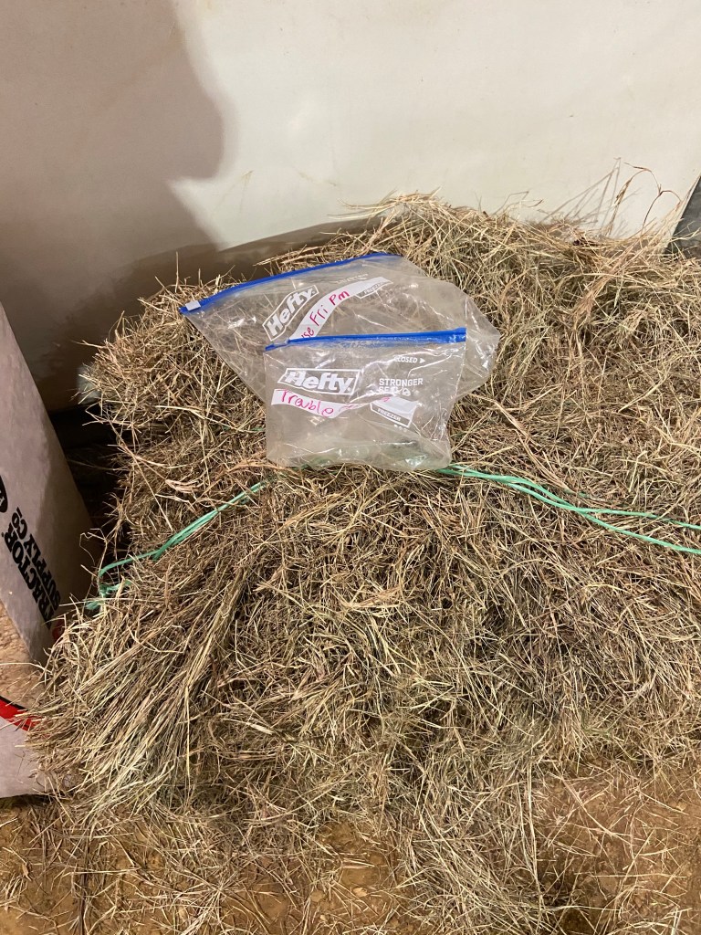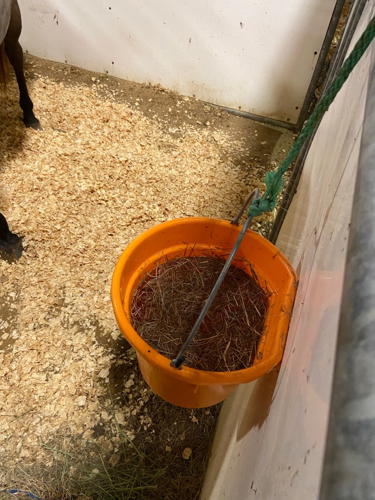 Hay – both grass hay and alfalfa if you feed both. Remember that they have no pasture and will be bored standing in a stall. Bring extra hay.