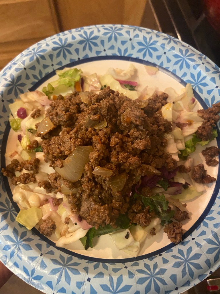 Taco meat is so simple and easy to adapt to low carb. I brown my ground beef – you can also use chicken – add onions, taco or fajita seasoning, and fresh peppers if you like.