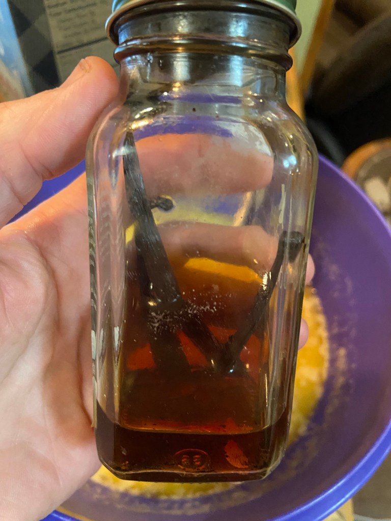 Now for the vanilla extract. I make my own using vanilla beans and bourbon. Use the best vanilla you can get your hands on.