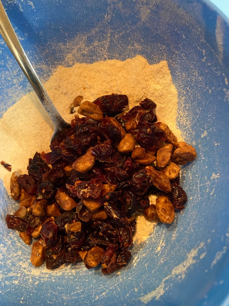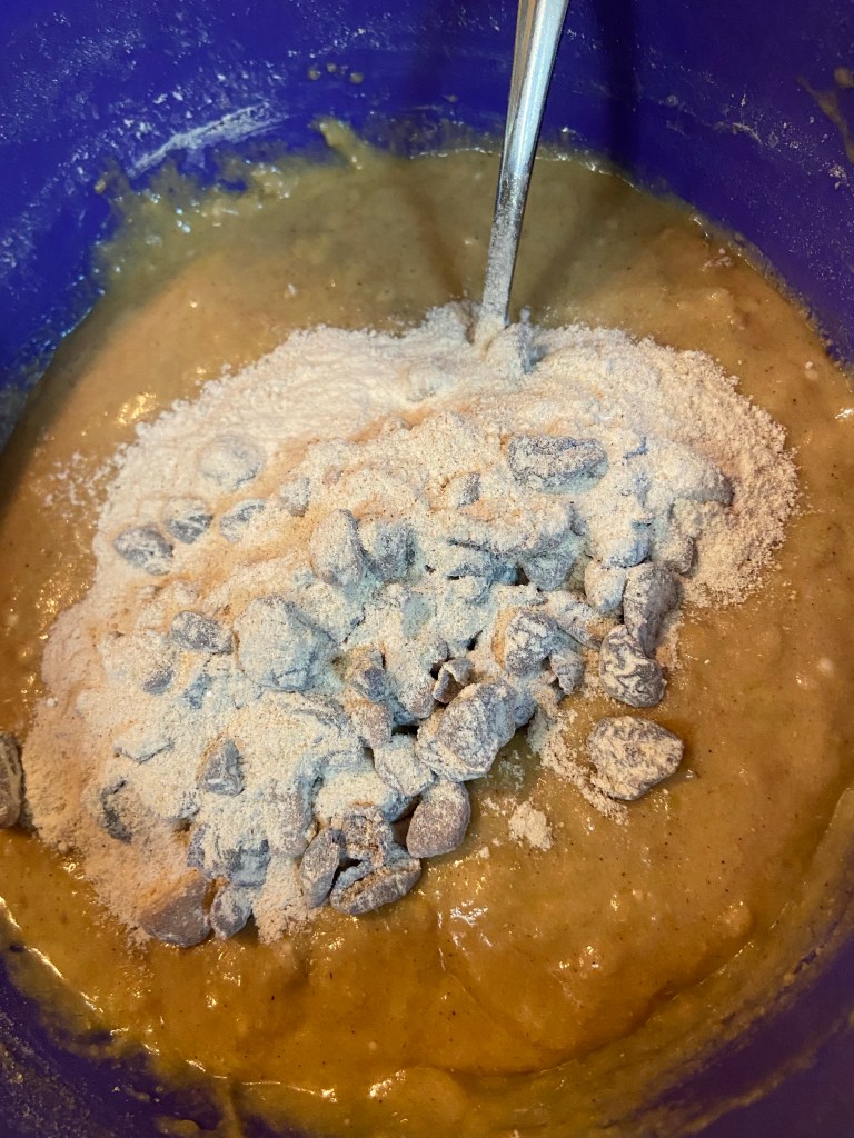 I saved about 1/2 cup to coat my cranberries and pecans. This prevents your heavy pieces from sinking to the bottom.