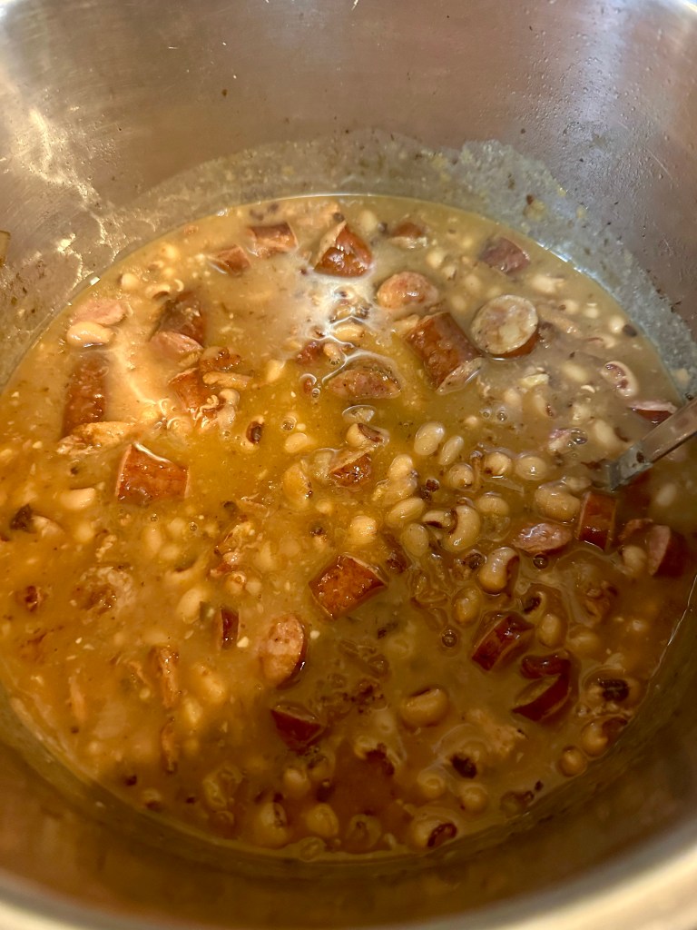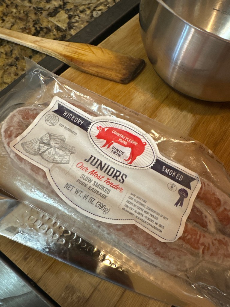 I have set out my sausage to thaw. We keep a freezer full. We tend to use either homemade or Cooper’s Country Pleasin’. I prefer to add the smoked sausage later, after the peas have cooked. The sausage is already smoked, so you can easily overcook it and cause the texture to be off.