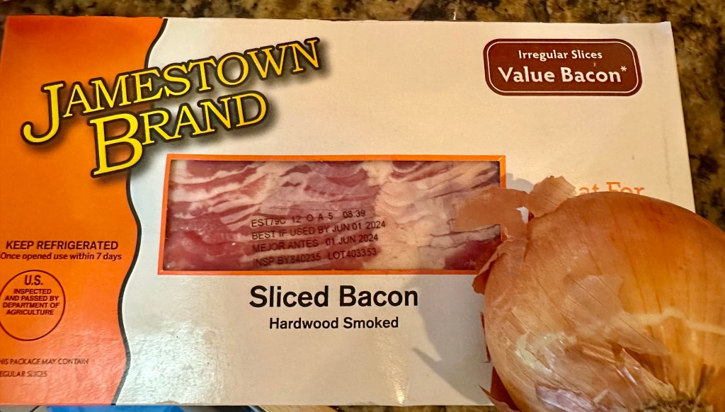 Most things in my kitchen start with bacon and onions. I use this bacon for a base. I buy (or we smoke our own) nice bacon to simply eat. But this is a pack of “ends & pieces” which still tastes good, it’s just not pretty to look at.