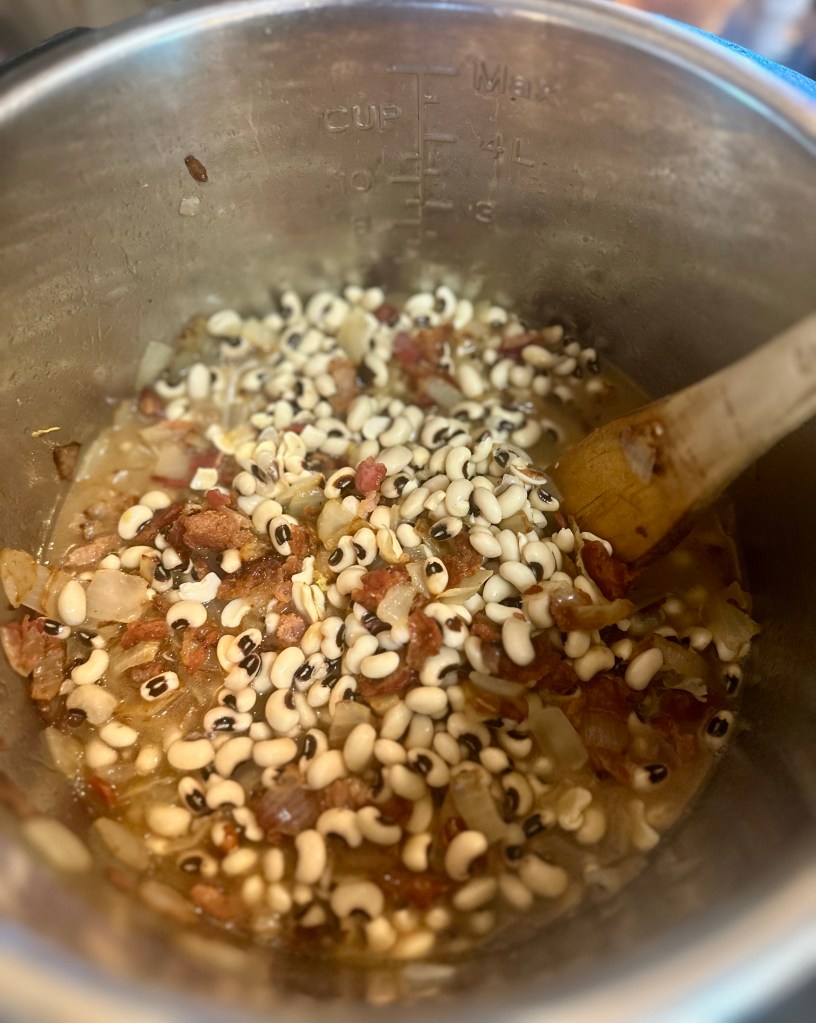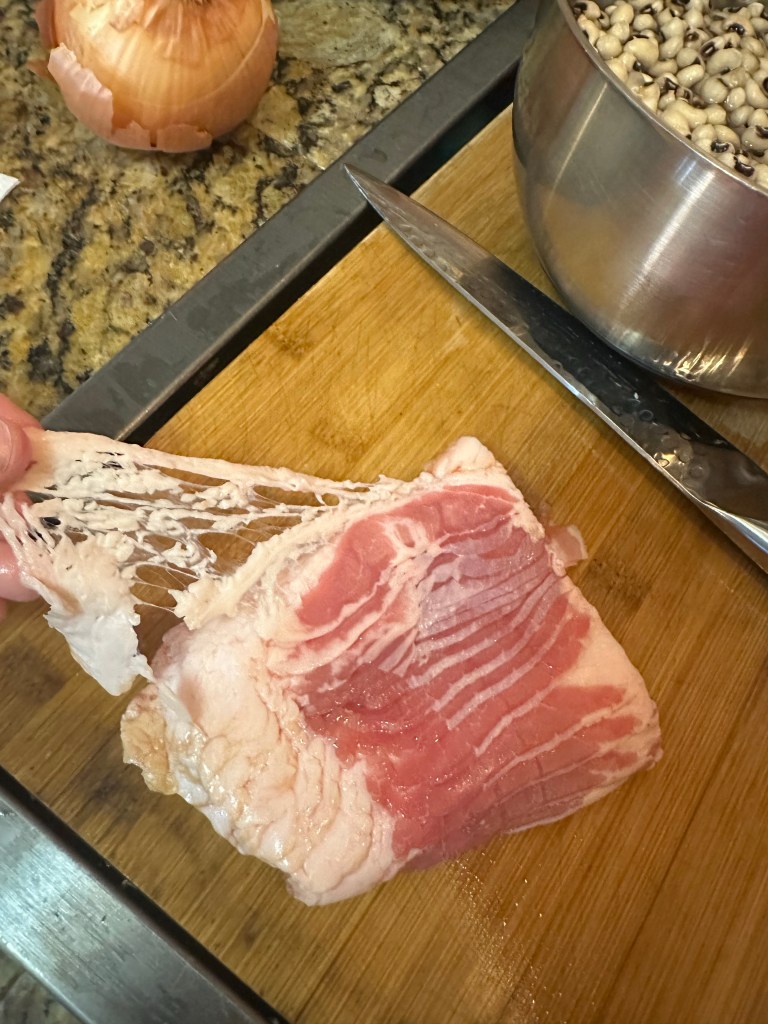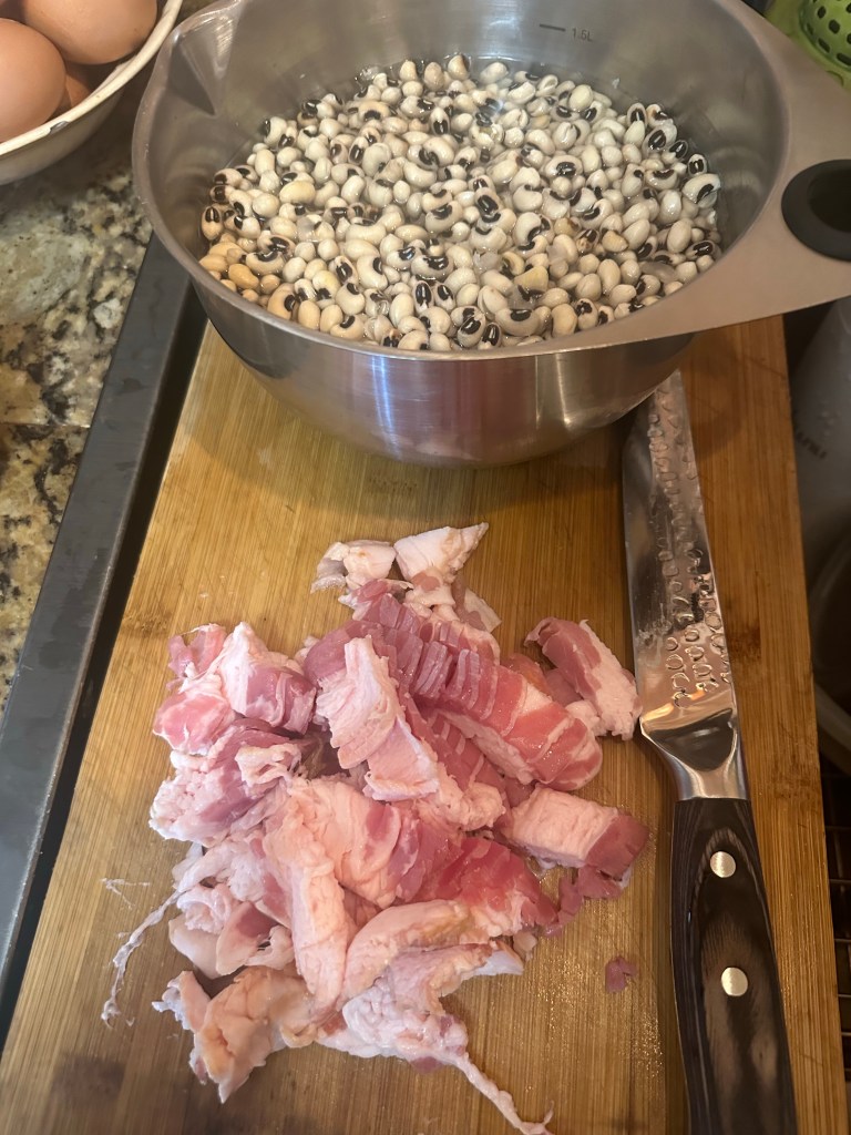 Rinse the peas well, then soak them in hot water while preparing the bacon and onions.